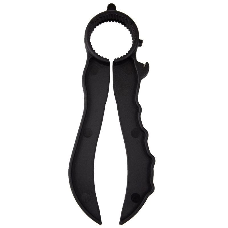 Ouvre-bouteille multi-usage noir en plastique. Sa forme lui permet d'ouvrir les canettes de boissons gazeuses, les bouchons à vis et autres récipients. Sa simplicité d'utilisation en fait l'accessoire de cuisine idéal pour les personnes ayant des problèmes dans les articulations supérieures.