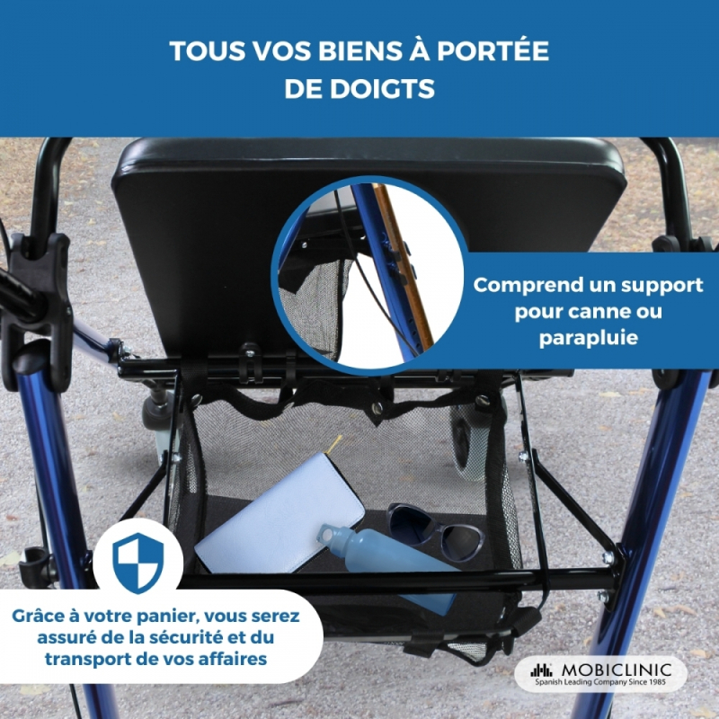 Grâce au panier de ce déambulateur à 4 roues, vous pourrez faire toutes vos courses sans aucun problème, à l'intérieur vous trouverez une poche dans laquelle vous pourrez ranger vos documents ou clés pour les garder à portée de main.