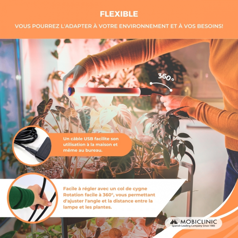 FLEXIBILITÉ : Grâce à son bras flexible rotatif à 360°, vous pouvez ajuster l’angle et la distance entre la lampe et vos plantes. Son câble USB la rend pratique à utiliser à la maison comme au bureau.