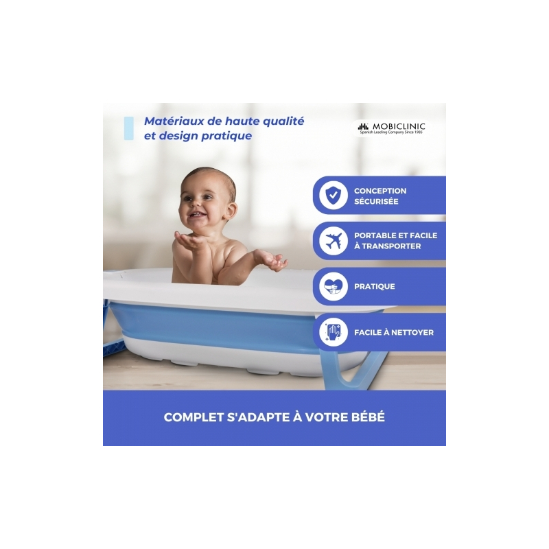 Pack de bain bébé | Baignoire enfant | Pliable | Antidérapant | Bleu | Thermomètre de bain | Sans mercure | Mobiclinic