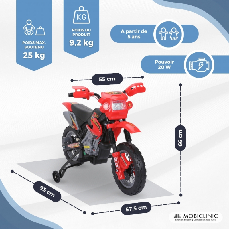 La moto électrique MobiCross est conçue pour offrir une expérience passionnante et sûre aux enfants de 5 ans et plus. Avec une conception robuste et fonctionnelle, cette moto électrique est parfaite pour jouer aussi bien à l'intérieur qu'à l'extérieur, aidant les enfants à développer leur motricité et leur coordination tout en s'amusant.