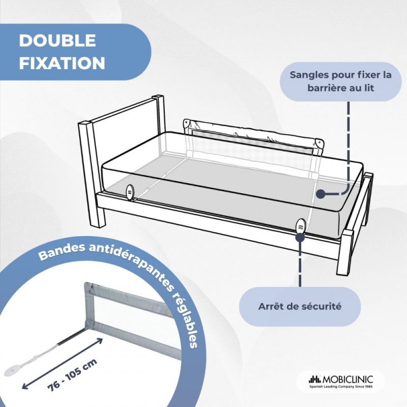 SÉCURITÉ SUPPLÉMENTAIRE GRÂCE AUX FIXATIONS : Son système de double verrouillage avec ancrage et sangle de sécurité supplémentaire sous le matelas permet à la barrière de sécurité de rester bien en place et d'éviter qu'elle ne se détache du lit. Un choix idéal pour la tranquillité d'esprit des parents et la sécurité des tout-petits !