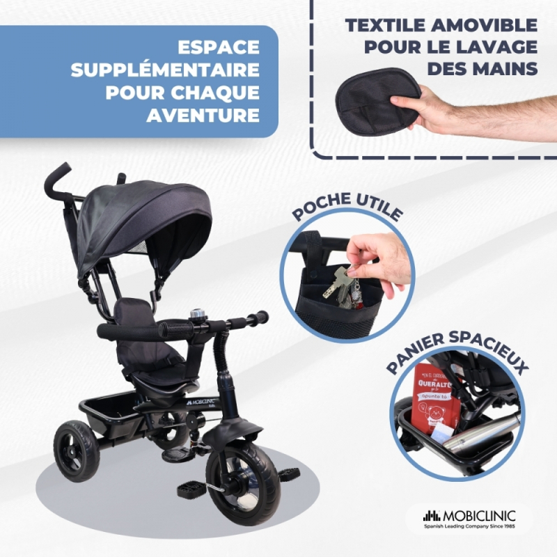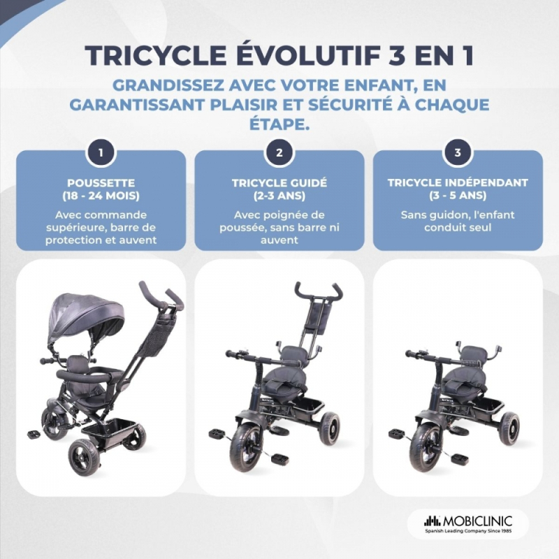 Tricycle 3 en 1| Evolutif| Réglable| Max 25 kg|18 mois à 5 ans| Léger| LULU Black|Mobiclinic