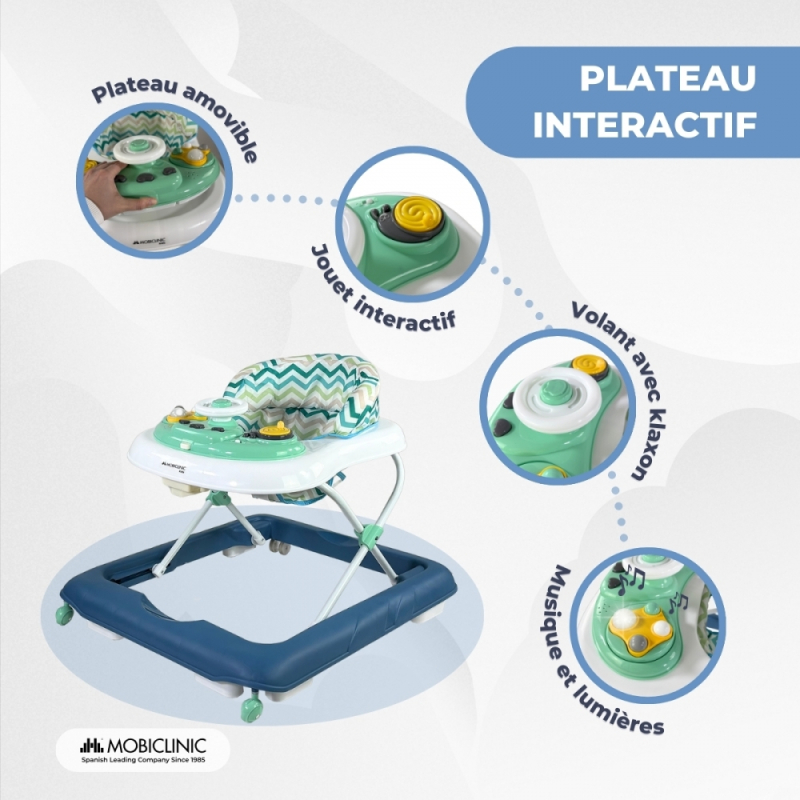 Elle comprend un plateau interactif équipé de trois jouets, de lumières et de musique, qui divertit bébé tout en l'invitant à explorer. Le plateau est amovible, permettant ainsi à bébé de jouer séparément et offrant une option ludique supplémentaire.