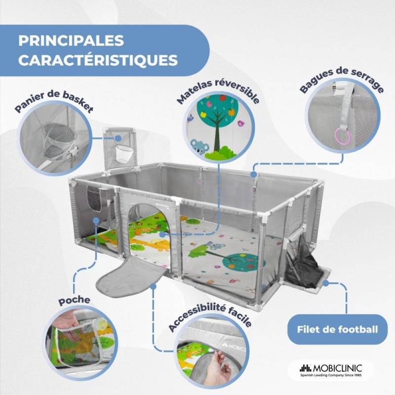 Grâce à ses dimensions de 128 x 233 cm, il offre un espace de jeu spacieux et confortable où les petits peuvent ramper, se tenir debout, jouer ou faire leurs premiers pas en toute sécurité. Le tapis inclus offre également une surface rembourrée qui isole le sol et favorise le jeu ou le repos.