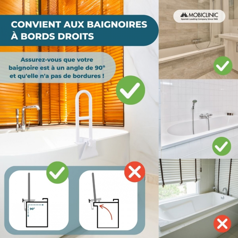 Il s'adapte aux baignoires aux bords lisses et plats, d'une largeur minimale de 4,5 cm à maximale de 13,5 cm, et s'adapte à différents modèles. Sa poignée ergonomique permet une prise en main ferme et sûre, même avec les mains mouillées. Il se distingue principalement par sa conception robuste, capable de supporter jusqu'à 100 kg, et est idéal pour un usage clinique et domestique.