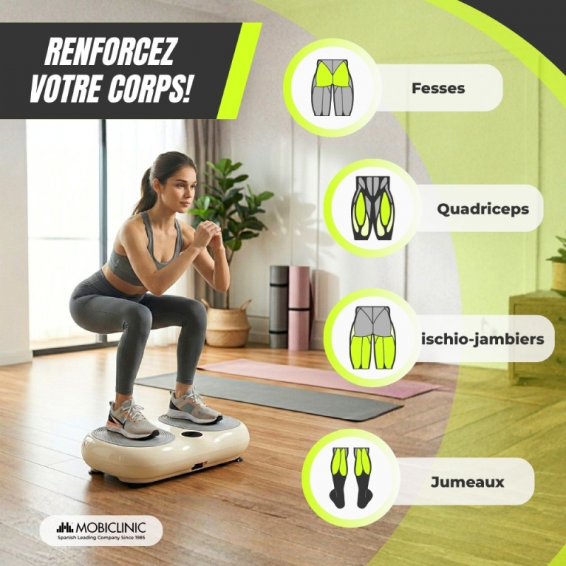 Plateforme vibrante | 99 niveaux de vitesse | 9 programmes | Bandes élastiques | Écran et télécommande | Karol | Mobiclinic