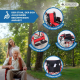BLOCKIERSYSTEM: Der Rollstuhl verfügt über zwei unabhängige Bremssysteme. Das erste blockiert die Räder, wenn die Bremshebel an den Griffen nach oben gezogen werden; zum Entriegeln einfach den roten Sicherungsknopf drücken. Das zweite System funktioniert über einen Hebel an den Rädern, der nach vorne gezogen wird, um die Räder zu blockieren, und nach hinten, um sie zu entriegeln.