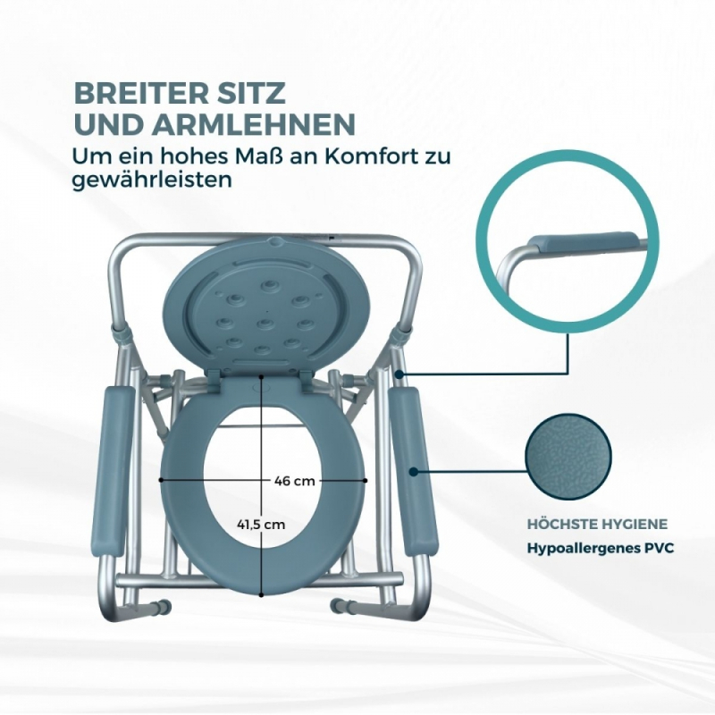 Der Toilettenstuhl des Modells Mar eignet sich perfekt für Menschen, die Schwierigkeiten beim Zugang zur Toilette haben, wie ältere Menschen oder Menschen mit Mobilitätsproblemen. Dank dieses Toilettenstuhls wird ihr Alltag einfacher, da er sie in so wichtigen Momenten wie dem Gang zur Toilette entlastet.