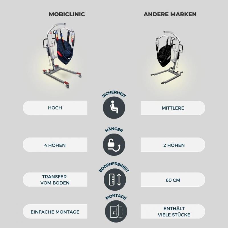 SICHERHEIT: Reduziert das Verletzungs- und Sturzrisiko für Patient und Pflegekraft. Der Hebebügel ermöglicht es, den Patienten während des Transfers zu halten und so für Stabilität zu sorgen. Ein Not-Aus-Schalter ermöglicht das manuelle Anheben und Absenken des Patienten.