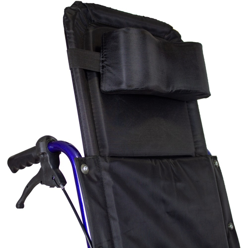 Dieser Transportrollstuhl verfügt über einen Fußhebel, der dem Begleiter, der den Rollstuhl schiebt, beim Auf- und Absteigen kleiner Stufen eine große Hilfe ist.
