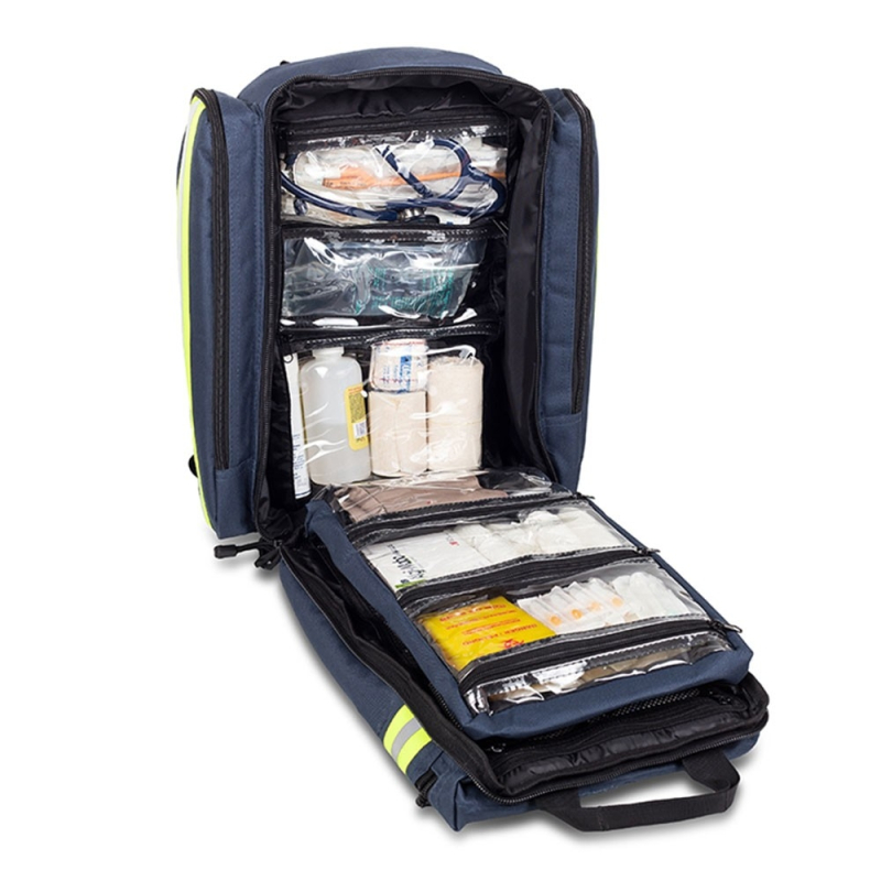 Dieser blaue Rettungsrucksack für medizinische Notfälle verfügt über transparente Inneneinteilungen in verschiedenen Größen, die sich an die Bedürfnisse und Maßnahmen eines Erste-Hilfe-Teams anpassen. Es handelt sich um eine wasserdichte, nützliche und sichere medizinische Notfalltasche für kritische Situationen, die aufgrund ihrer Abmessungen und Eigenschaften eine der vollständigsten auf dem Markt ist.