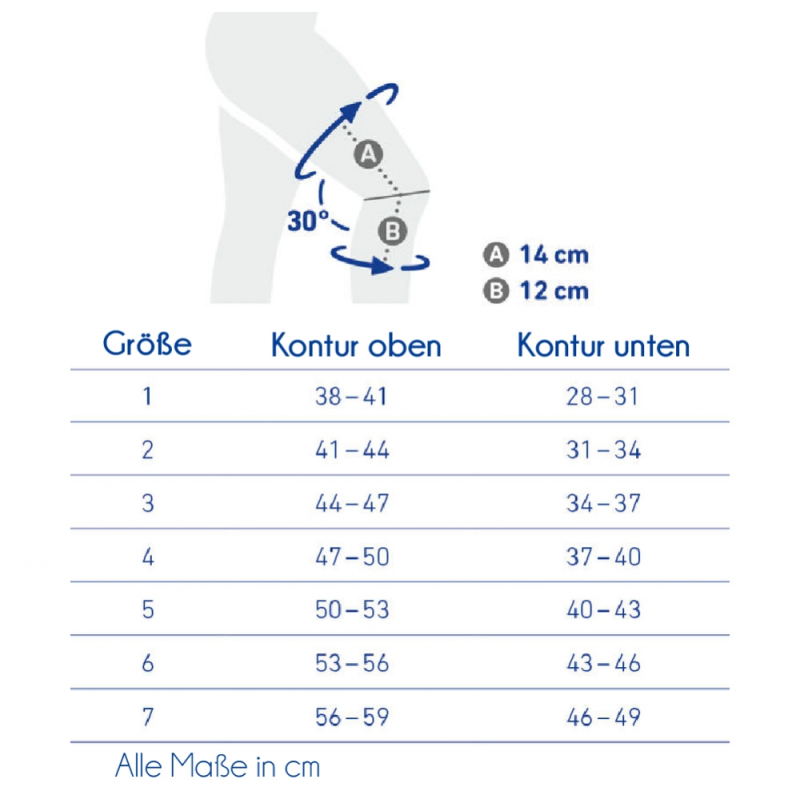 Die Größe richtet sich nach dem Umfang des Oberschenkels, wobei das erste Maß die obere Kontur und das zweite Maß die untere Kontur darstellt.