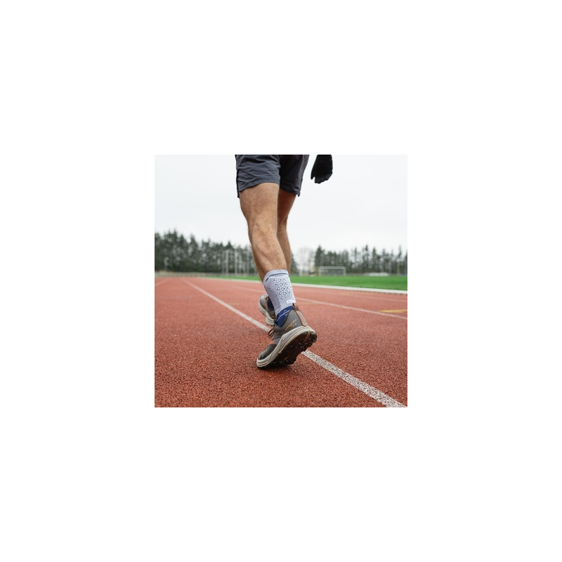 Ein anatomisch geformtes Polster massiert und stimuliert das umliegende Gewebe. Ein integriertes Fersenpolster entlastet die Sehne. Dies führt zu einem schnelleren Rückgang von Ödemen und Ergüssen.