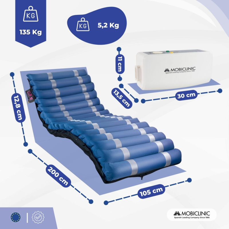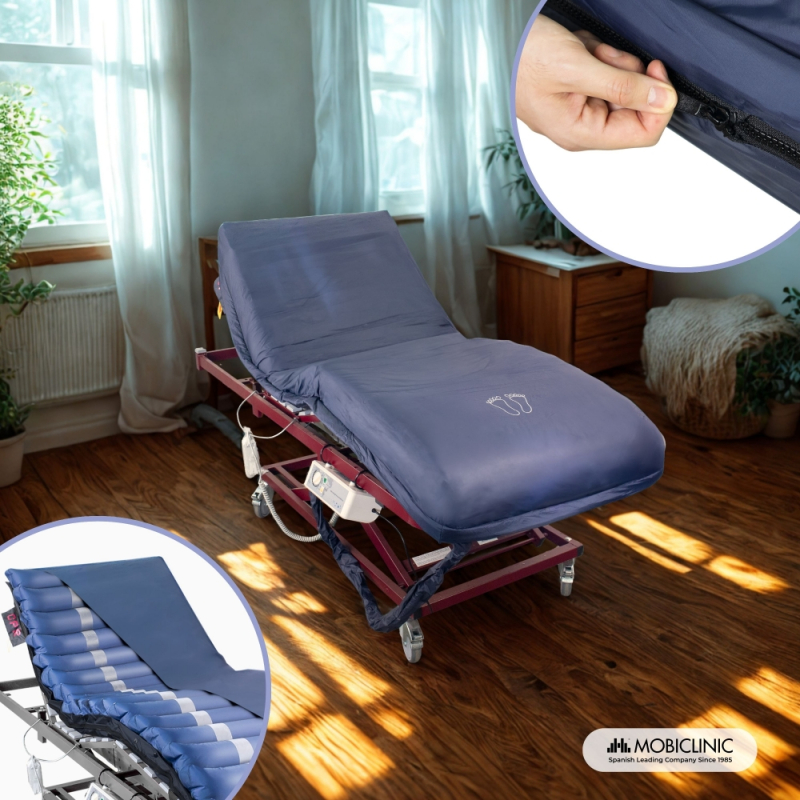 Es passt auf jedes Bett und kann daher zu Hause oder im Krankenhaus verwendet werden. Es sorgt für einen erholsamen, komfortablen und sicheren Schlaf. Die Installation ist kinderleicht: Es wird über eine Anti-Dekubitus-Matratze gespannt, wobei die Schläuche am Fußende des Bettes bleiben, um sie mit dem mitgelieferten leisen Kompressor zu verbinden.