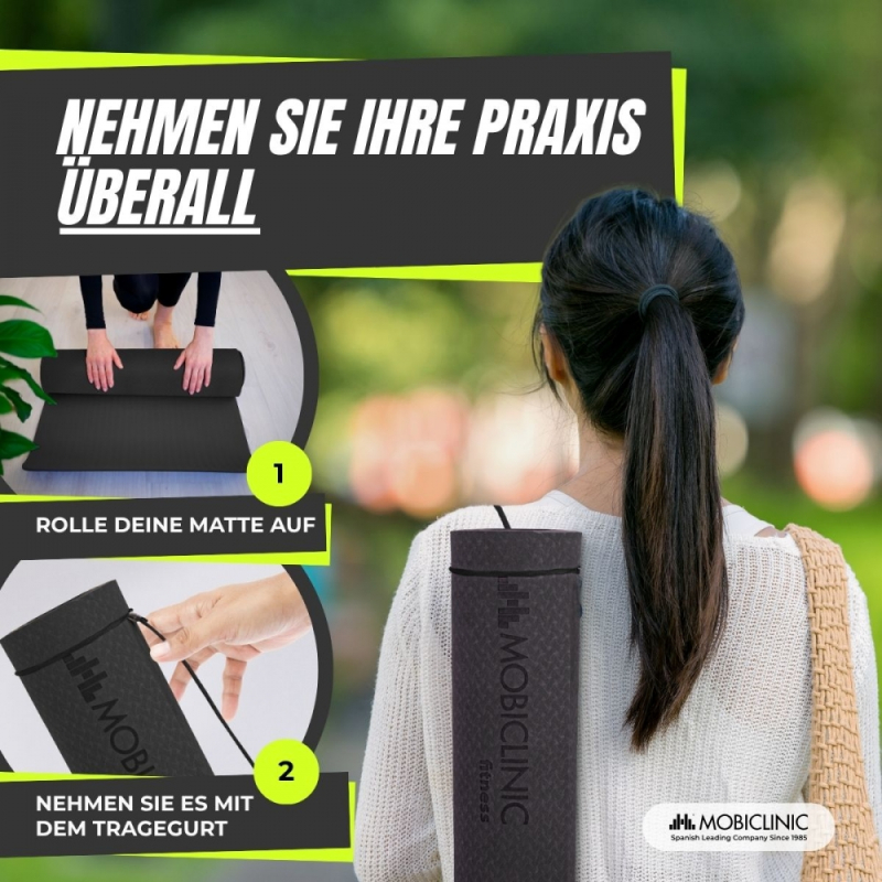 Außerdem ist diese Yoga- und Pilatesmatte mit einem Tragegurt ausgestattet, mit dem sie leicht und bequem transportiert werden kann. Daher können Sie sie problemlos mit ins Fitnessstudio, in den Park oder an jeden anderen Ort nehmen, an dem Sie trainieren möchten.