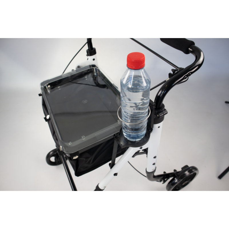 - Halterung für Flaschen oder Gläser: Mit diesem Werkzeug können Sie dank seiner einfachen Installation alle Arten von Getränken sicher transportieren. Für mehr Stabilität verfügt er unten über eine Ablage und oben über einen Klemmring . Er ist so konzipiert, dass er jede Art von Becher oder Flasche fest und sicher hält, lässt sich leicht an die Struktur des Gehwagens anpassen und lässt sich bei Nichtgebrauch zusammenklappen.