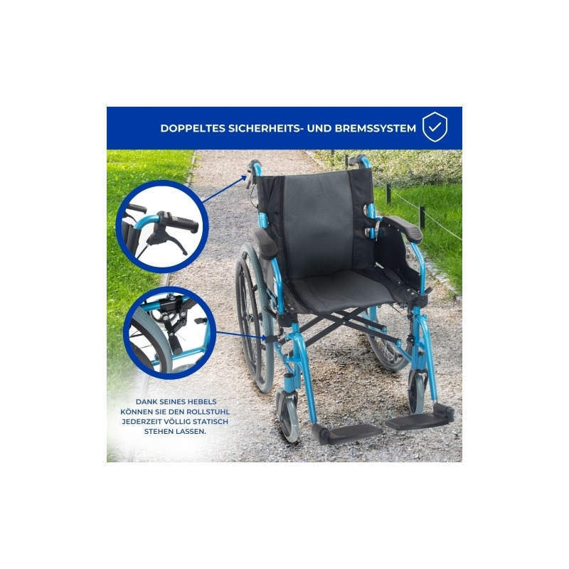 Paket Bolonia Plus | Faltrollstuhl | Blau | Aluminium | Anti-Dekubitus-Kissen | Viskoelastisch | Mobiclinic