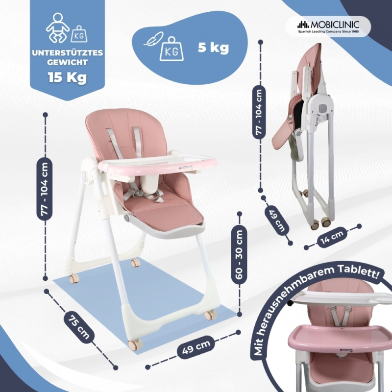 Hochstuhl mit Rädern | Evolutive | Höhenverstellbar | Zusammenklappbar | Sicherheitsgurt | Bis 15kg | Rosa | Simba | Mobiclinic
