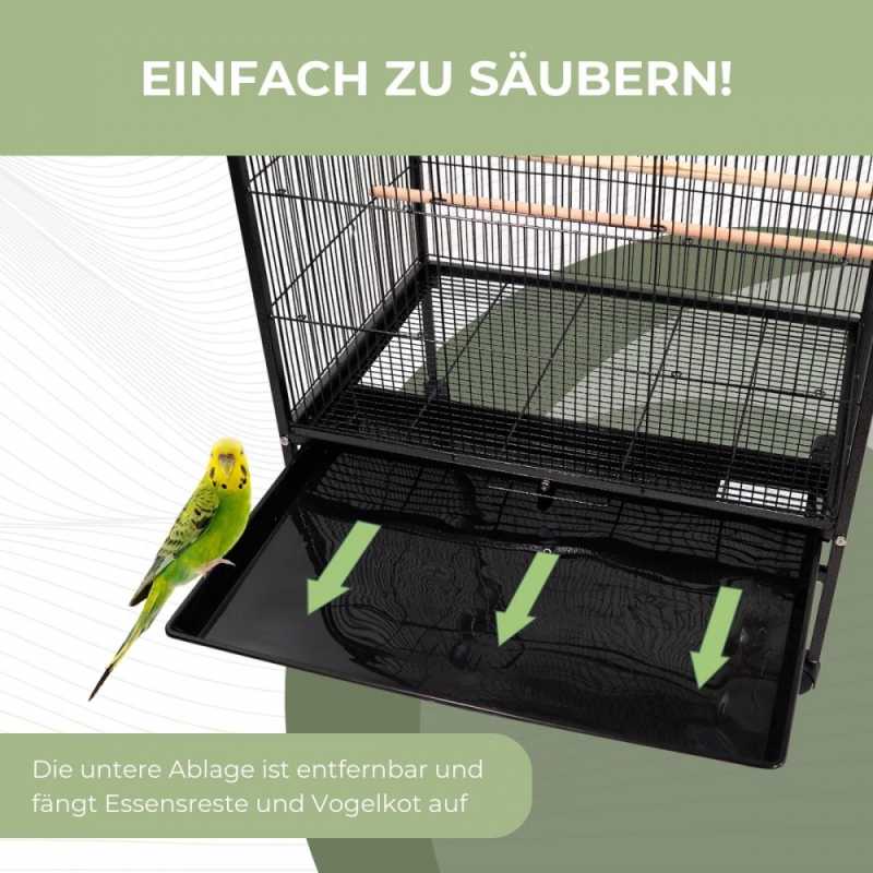 Darüber hinaus verfügt der Käfig über vier schwenkbare Beine, sodass Sie Ihre Vögel mühelos in jeden Raum oder sogar über die Terrasse oder in den Garten bewegen können. Die Bremsen ermöglichen es Ihnen, den Käfig sicher zu fixieren und ein übermäßiges Verrutschen zu verhindern.
