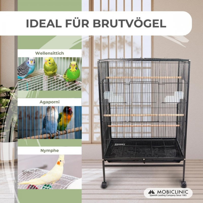 XL-Vogelkäfig | 95 x 43 x 61,5 cm | 8 Türen | Futter- und Wasserspender | Räder | Herausnehmbare Schale | Ninfa | Mobiclinic