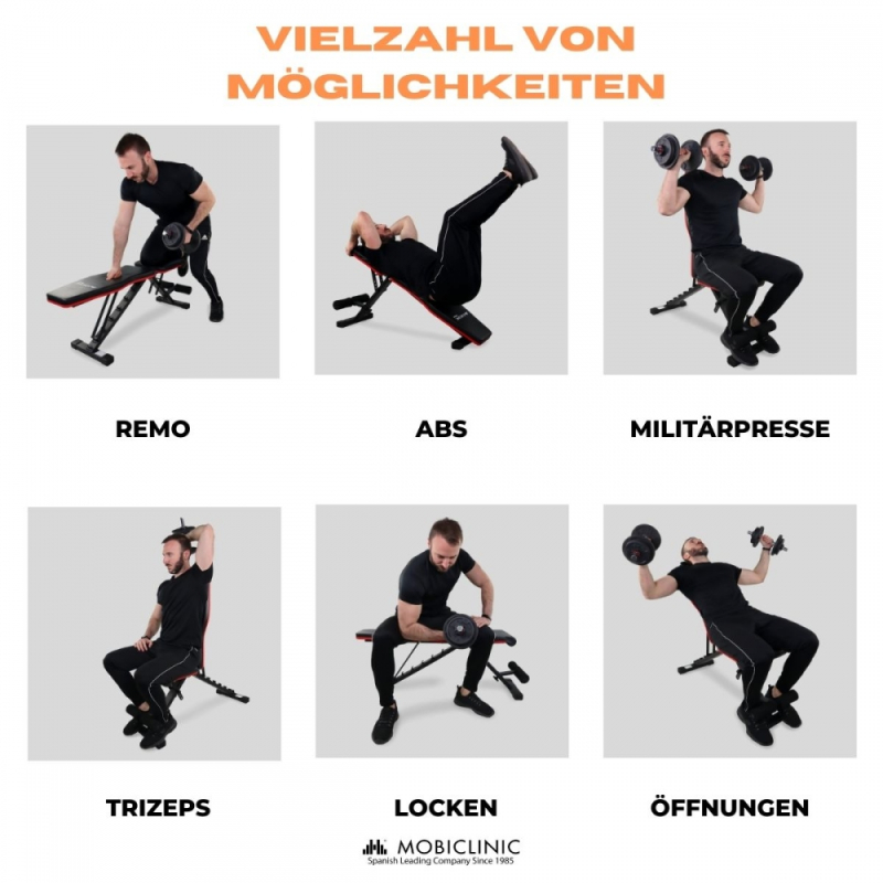 Multifunktionale Trainingsbank | Ultrakompakt faltbar | Max 200 kg | Verstellbar | Tragegriff | FlexFit | Mobiclinic