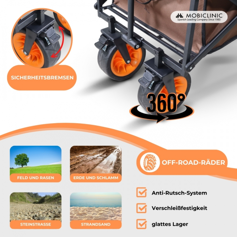 ALLES GELÄNDE: Das Design des Duna-Lastenwagens zeichnet sich durch seine Vielseitigkeit aus. Mit seiner Fähigkeit, verschiedene Gelände zu bewältigen, von ebenen Flächen bis hin zu rauerem Gelände , ist dieser Transportwagen die ideale Wahl für Outdoor- und Alltagsaktivitäten.