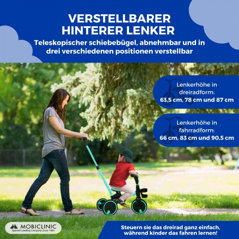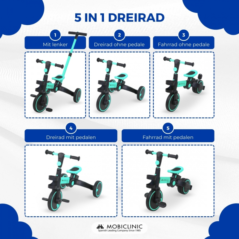 5-in-1 Dreirad | Umbaubar | Verstellbar | Max. 25 kg | Leichtgewicht | 1,5–5 Jahre | Blau | Chase | Mobiclinic