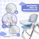 Sicherheit steht bei uns an erster Stelle , ein 5-Punkt-Gurt sowie Rad- und Schaukelbremsen verhindern Stürze . Seine 4 um 360° drehbaren Räder ermöglichen absolute Manövrierfähigkeit. Das in 3 Positionen abnehmbare Doppeltablett ist leicht zu reinigen und das einfache Faltsystem ermöglicht die Aufbewahrung in jedem kleinen Raum.