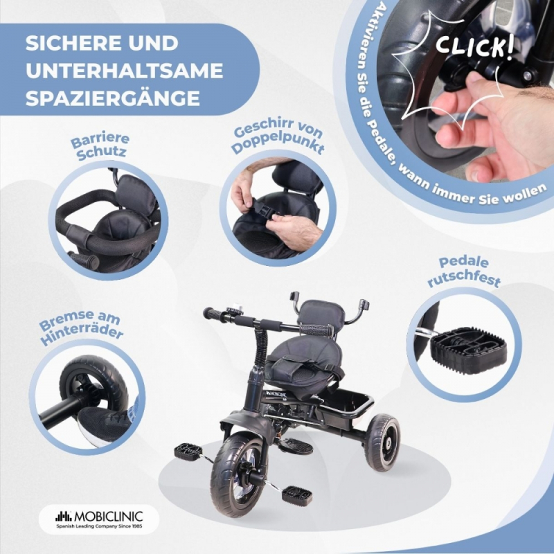 SICHER : Das Dreirad verfügt über einen Sicherheitsgurt und eine Schutzbarriere. Darüber hinaus verfügt es über eine Bremse am Hinterrad und einen Kupplungsknopf, der es dem Kind ermöglicht, die Pedale zu benutzen, ohne das Rad zu bewegen, was für mehr Sicherheit sorgt. Die EVA-Verbundreifen können sowohl innerhalb als auch außerhalb der Stadt verwendet werden und bieten eine sanfte und leise Fahrt.