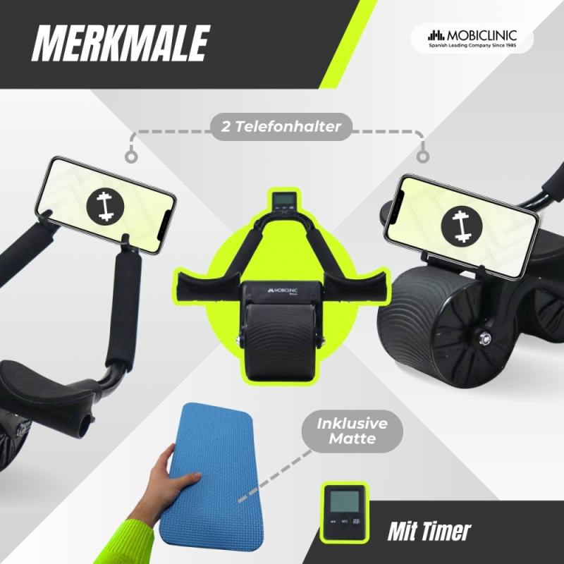 Dieser Roller verfügt über drei Zubehörteile, die ihn noch umfassender machen: einen digitalen Timer zur Festlegung von Arbeitsintervallen und zur Kontrolle der Zeit Ihrer Übungen, wodurch jede Sitzung maximal optimiert wird. Dadurch können Sie Ihre Leistung verbessern und einer strukturierten Routine folgen. Es verfügt außerdem über zwei Telefonhalter, mit denen Sie während Ihrer Übungen Videos ansehen oder Trainingsanwendungen verfolgen können, wodurch Ihre Routinen interaktiver und motivierender werden. Schließlich ist es mit einer rutschfesten Matte ausgestattet, die einen sicheren und bequemen Platz für Ihr Training garantiert, Ihre Knie beim Rutschen schützt und besseren Halt bietet.