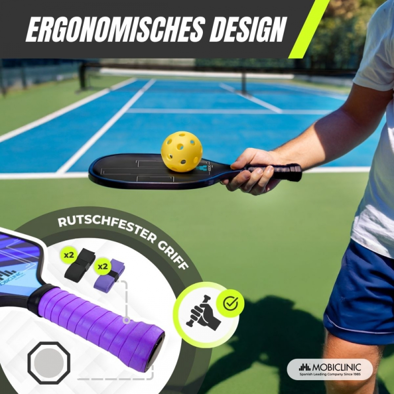 Das Mobiall Pickleball-Set ist die perfekte Wahl für Anfänger und erfahrene Spieler, die Spaß und ein umfassendes körperliches Training suchen. Es enthält vier Schläger aus Fiberglas mit einem Polymer-Wabenkern, einem Material, das Kontrolle und Power beim Spiel vereint. Die ergonomischen Griffe mit rutschfestem, saugfähigem Griff sorgen für einen angenehmen Halt.