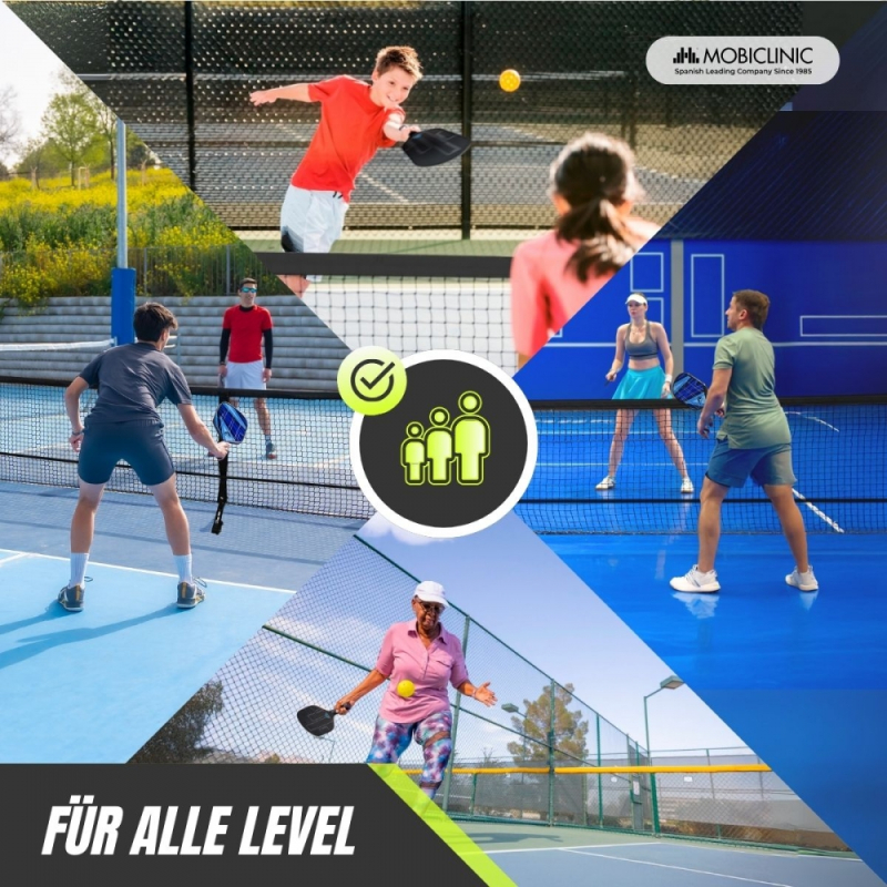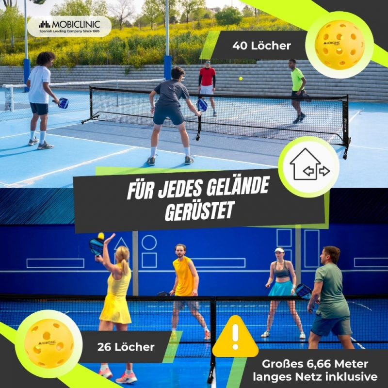 Pickleball-Set | 4 Schläger | 4 Bälle | Netz mit Rädern | Tragetasche | Rutschfester Griff | Mobiall | Mobiclinic