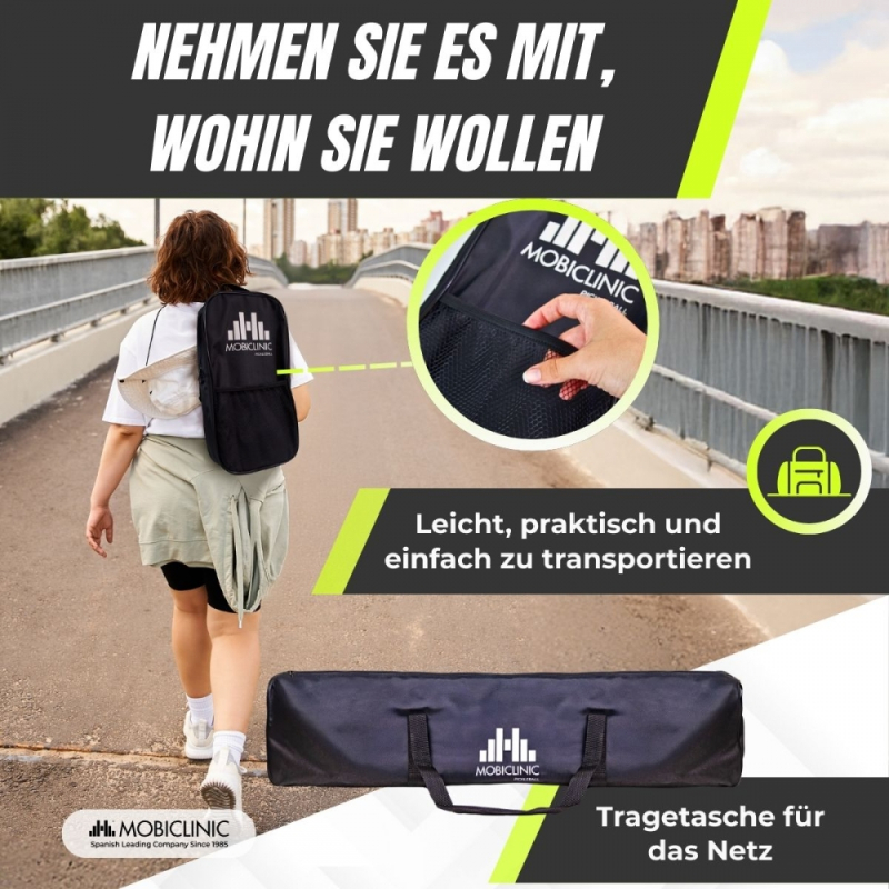Für einen einfachen Transport verfügt es über eine praktische Tasche mit zusätzlichem Vorderfach, ideal zur Aufbewahrung von Bällen, Griffen oder sonstigem Zubehör. Es verfügt außerdem über ein 360°-Rollnetz, das das Spielerlebnis verbessert und es Ihnen ermöglicht, es überallhin mitzunehmen.