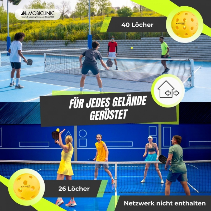 Das Mobiall Pickleball-Set ist die perfekte Wahl für Anfänger und erfahrene Spieler, die Spaß und ein umfassendes körperliches Training suchen. Es enthält vier Schläger aus Fiberglas mit einem Polymer-Wabenkern, einem Material, das Kontrolle und Power beim Spiel vereint. Die ergonomischen Griffe mit rutschfestem, saugfähigem Griff sorgen für einen angenehmen Halt.