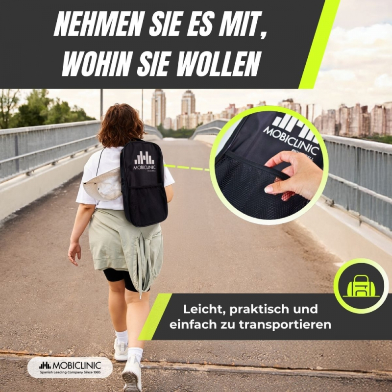 Für den einfachen Transport wird es mit einer praktischen Tasche mit zusätzlichem Vorderfach geliefert, die sich perfekt zur Aufbewahrung von Bällen, Griffen oder anderem Zubehör eignet.