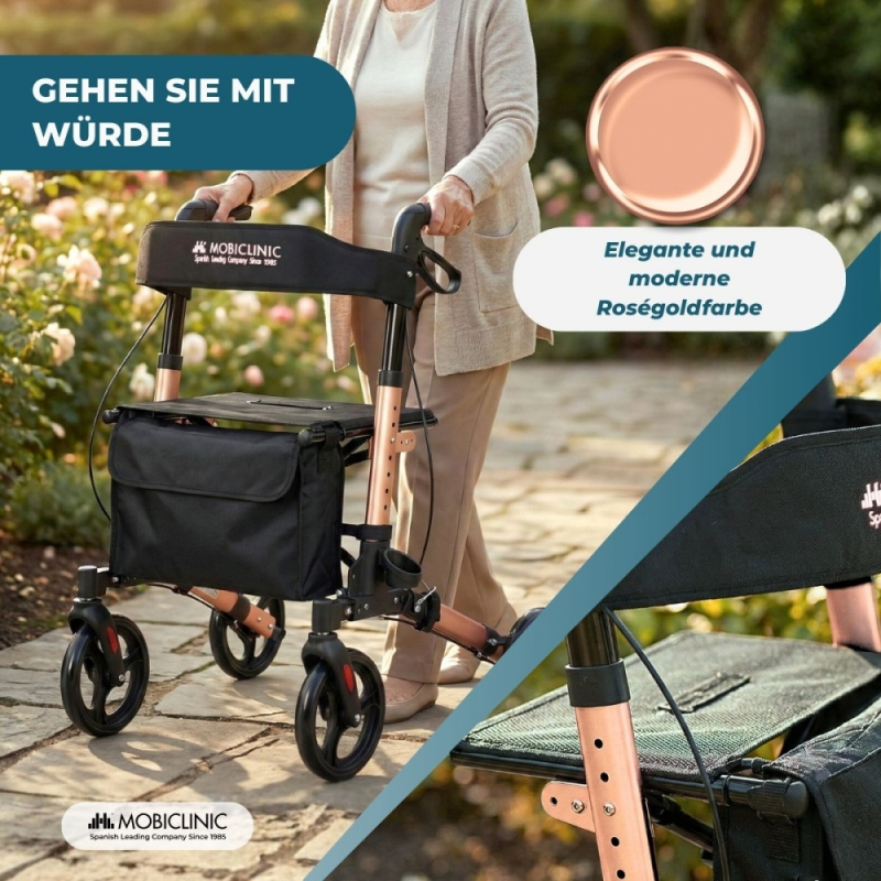 Faltbarer Rollator | Aluminium | Bis 136 kg | Handbremsen | Sitz und Rückenlehne | Roségold | Trajano | Deluxe | Mobiclinic