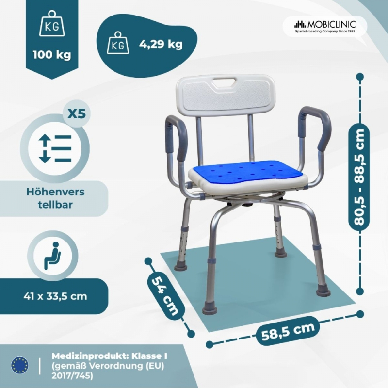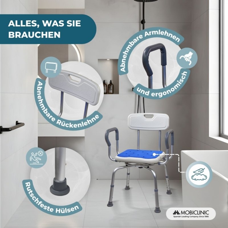 Drehbarer Badezimmerhocker | 360º Sitz | Höhenverstellbar | Armlehnen | EVA-Polsterung | Akila | Mobiclinic