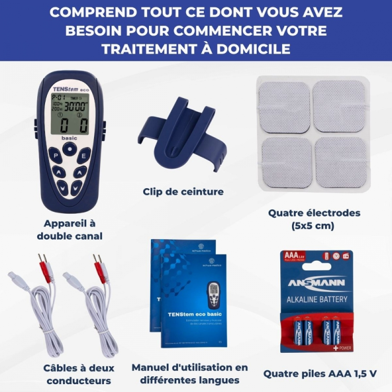 Le TENS Eco Basic à 2 canaux est un appareil moderne pour le traitement de la douleur et des courbatures. Cet appareil polyvalent peut être utilisé avec quatre électrodes simultanément. De plus, il propose une grande variété de programmes pour le traitement intensif de la douleur, la relaxation musculaire et l'amélioration de la circulation sanguine.
