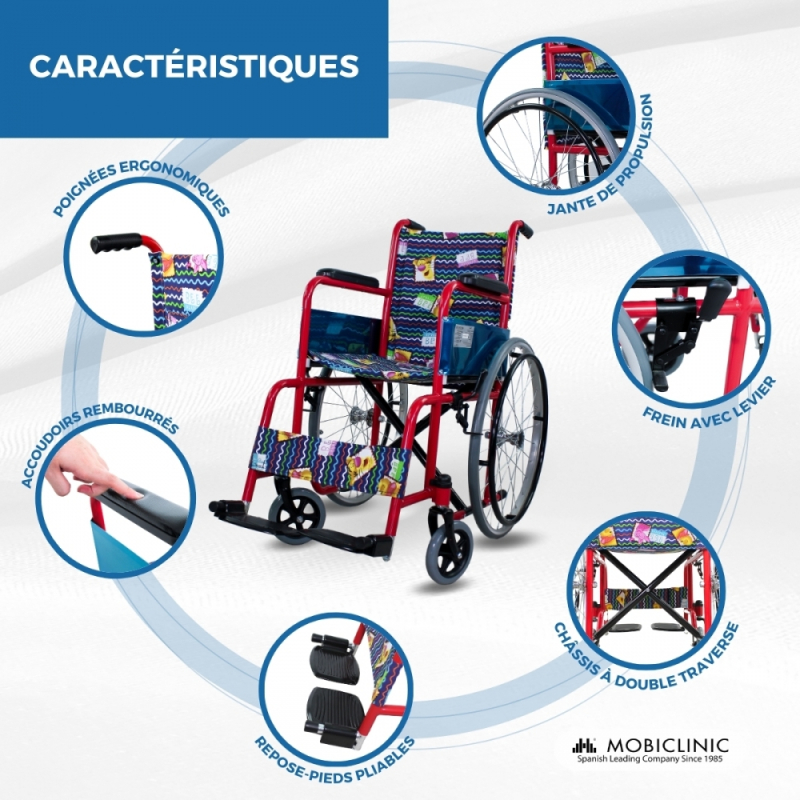 Fauteuil roulant pour enfants | Pliable | Grandes roues | Repose-pieds | Rouge avec imprimés | Théâtre | Mobiclinic