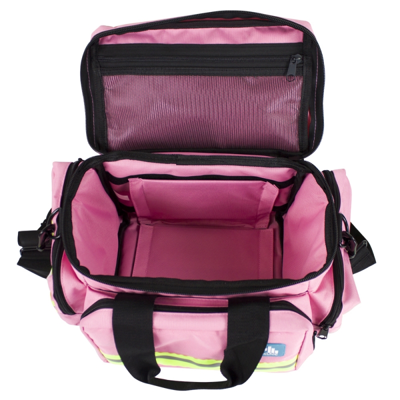 Ce sac médical est spécialement conçu pour les professionnels qui ont besoin de transporter du matériel spécifique. Il dispose de deux cloisons intérieures réglables et d'une poche filet pour faciliter l'organisation du matériel sanitaire, ainsi que de trois poches extérieures, deux d'entre elles transparentes et une frontale subdivisée par des bandes élastiques.