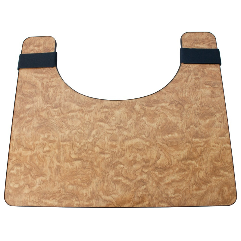 Ce plan de travail est fabriqué en aggloméré de 15 mm d'épaisseur de densité moyenne. Il s'adapte facilement à tous les types de fauteuils roulants grâce à ses sangles.