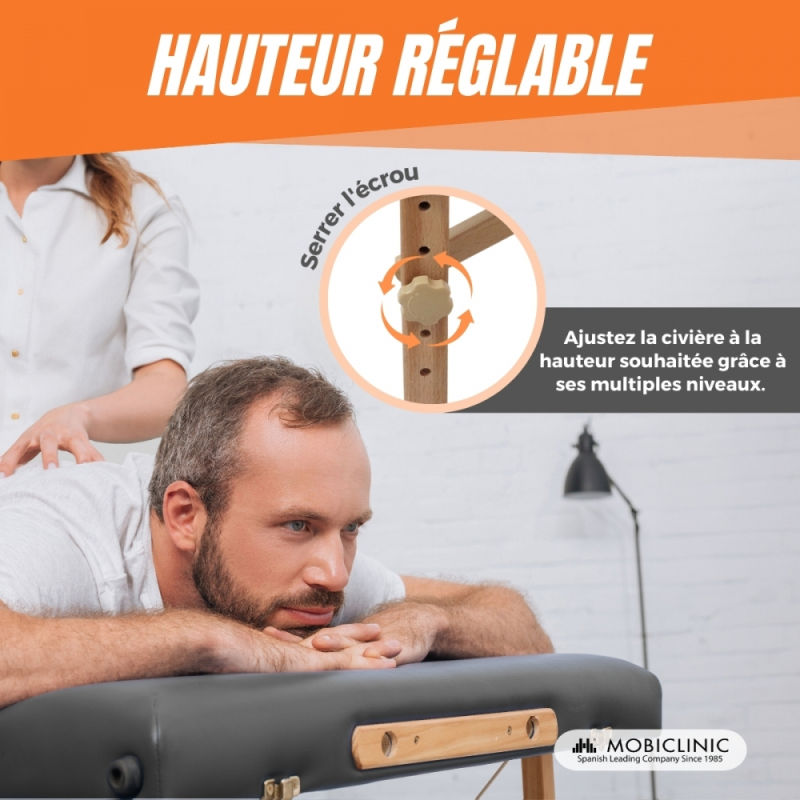 Elle est réglable en hauteur : très confortable tant pour les professionnels que pour les patients.