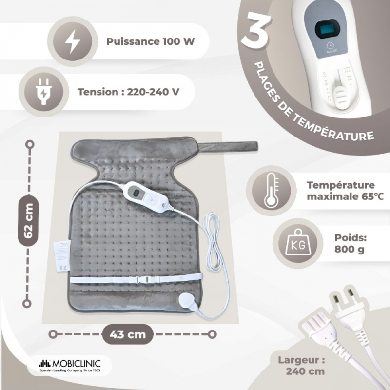 Coussin chauffant pour le dos et la nuque | 62x43 cm | 3 niveaux de chaleur | Arrêt automatique | Mobiclinic