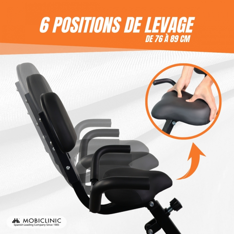 CONCEPTION ERGONOMIQUE ET SIÈGE RÉGLABLE : Ce vélo d'exercice a un design ergonomique, reflété dans son siège et son dossier rembourrés et réglables . Le siège peut être réglé jusqu'à 4 positions, de 76 à 89 cm , permettant de l'ajuster à différentes hauteurs, aidant ainsi l'utilisateur à trouver la meilleure position pour s'entraîner. De plus, ses poignées latérales assurent une posture correcte et offrent une stabilité qui rendra l'entraînement plus confortable et plus sûr.