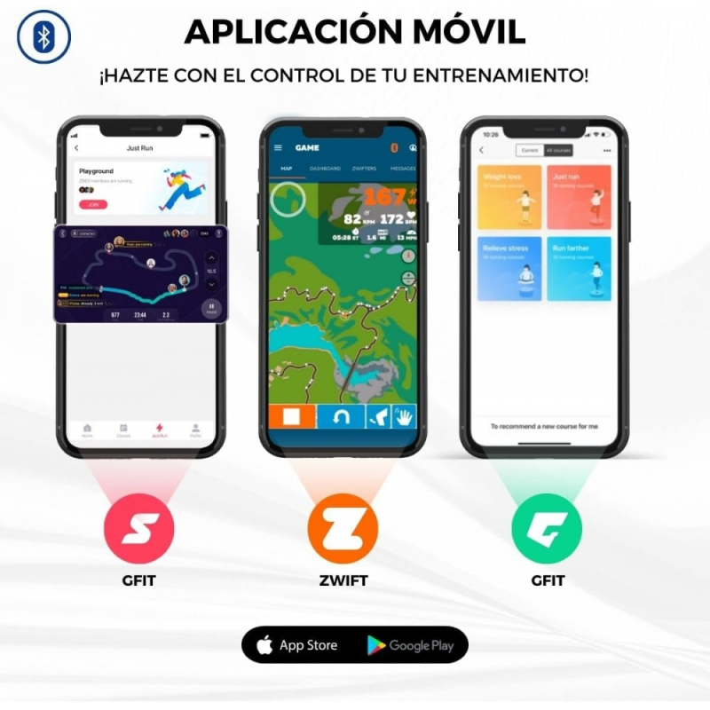 AVEC APPLICATION D'ENTRAÎNEMENT : le tapis roulant électrique Tibet peut être lié à des applications telles que Gfit, Zwift et SPAX qui permettent à l'utilisateur de suivre l'exercice de manière plus dynamique et divertissante. Avec ces applications, la combinaison du plaisir et de la formation vous aidera à atteindre vos objectifs avec une communauté qui vous motive à chaque minute. L'application Zwift est disponible en anglais, français, italien, allemand, espagnol, chinois et japonais, tandis que les deux autres ne sont disponibles qu'en anglais. De même, le tapis de course peut être utilisé sans l'application proposée car il dispose d'une barre LED avec 12 programmes d'entraînement.