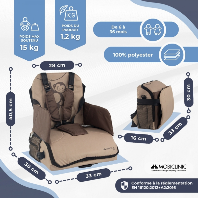 Chaise haute de voyage avec rangement| Pour bébé | Pliable | Avec poche et poignée | Jusqu'à 15 kg | Beige | Monkey | Mobiclinic