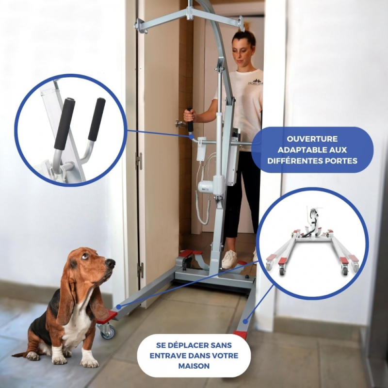 SÉCURITÉ ACCRUE : Réduit les risques de blessures ou de chutes pour le patient et le soignant. Il est équipé d'un crochet permettant de maintenir le patient pendant les transferts et d'assurer sa stabilité. Il est également équipé d'un bouton d'arrêt d'urgence permettant de lever ou d'abaisser manuellement le patient si nécessaire.