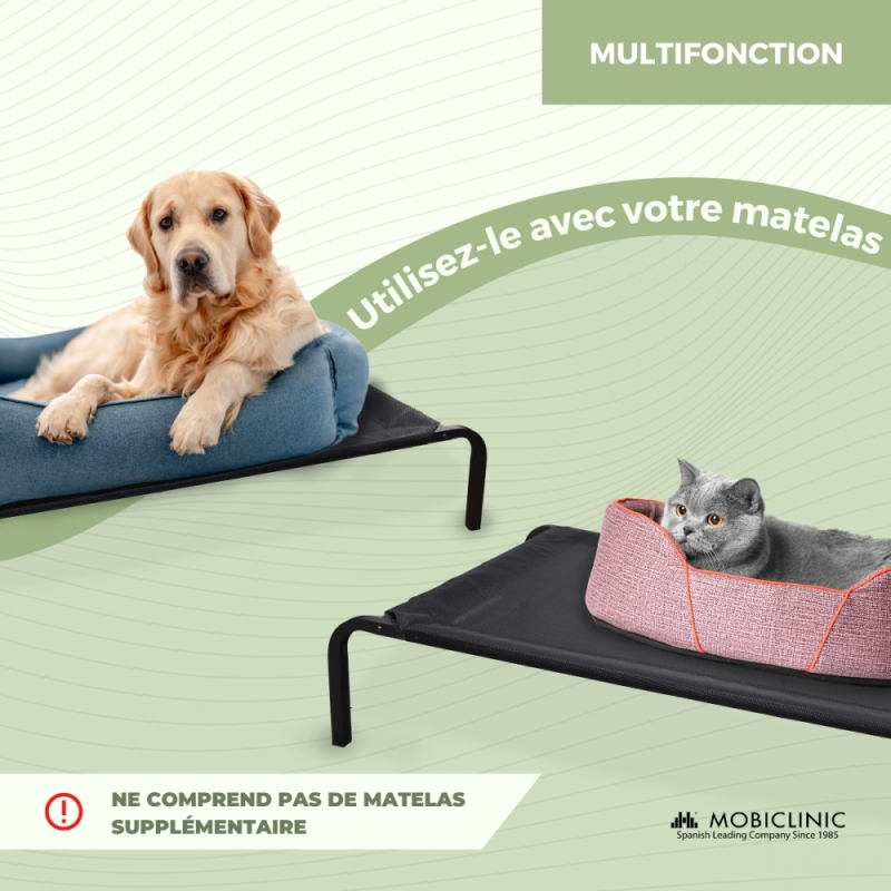 Lit surélevé pour animaux compagnie | Isolé | 122x71x21 cm | Max 60kg | Léger | Résistant | Noir | Cleo | Mobiclinic