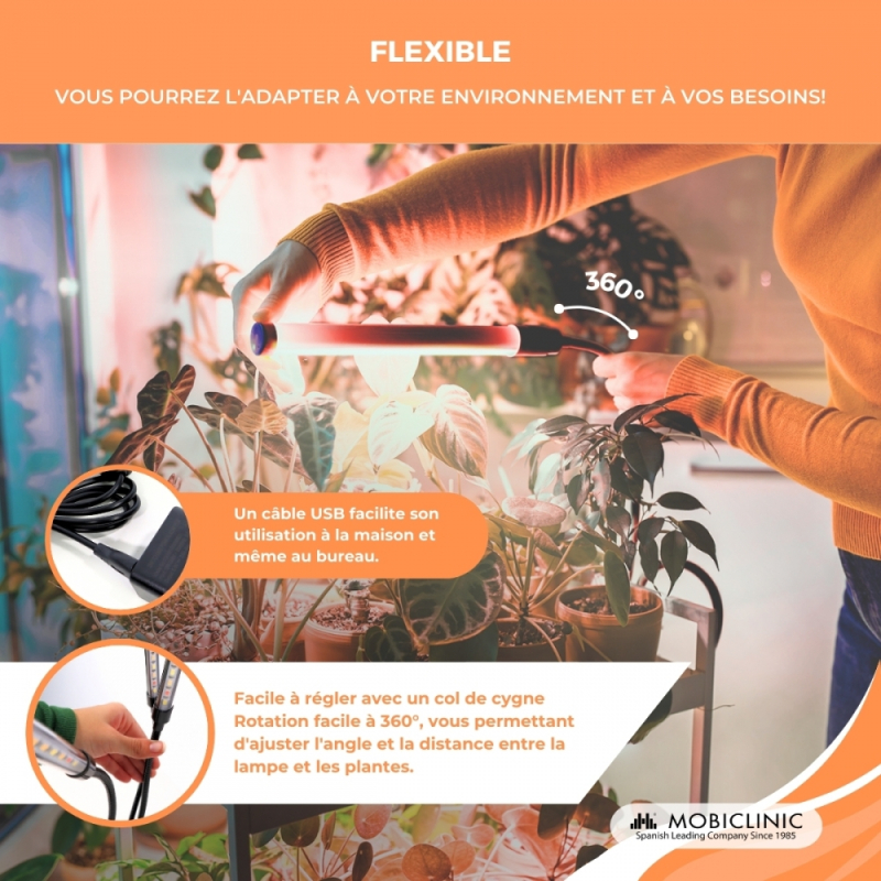 FLEXIBILITÉ : Grâce à son bras flexible rotatif à 360°, vous pouvez ajuster l’angle et la distance entre la lampe et vos plantes. Son câble USB la rend pratique à utiliser à la maison comme au bureau.